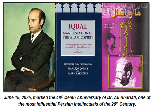 Dr Ali Shariati’s (November 23, 1933- June 18, 1977) scholarly work on Iqbal helped the readers of Persian literature gain insight into the message and thought of Dr Muhammad Iqbal (Iqbal Lahouri). Dr Ali Shariati is regarded as one of the most influential Persian intellectuals of the 20 th Century. He advocated instilling humanistic values in the younger generation by teaching them the true essence of Islam. He died on June 18, 1977, in Southampton, England. His unexpected passing has long been surrounded by controversy and suspicion. Many scholars and his supporters have alleged that he was assassinated by SAVAK, the secret police of Iran’s Shah. A comprehensive biography and overview of Dr Ali Shariati’s works is available at https://shariati.com/bio.html .