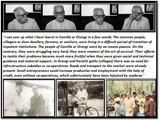 In another narrative “What I learnt in Comilla and Orangi,” AHK observes, “I can sum up what I have learnt in Comilla or Orangi in a few words: The common people, villagers or slum dwellers, farmers, or workers, were living in a difficult period of transition of impotent institutions. The people of Comilla or Orangi were by no means passive. On the contrary, they were struggling very hard; they were masters of the art of survival. Their efforts to tackle their problems became much more fruitful when they were given social and technical guidance and material support…In Orangi and Karachi goths (villages) there was no need for infra-structure subsidies or co-operatives. Roads and transport to the market were already present. Small entrepreneurs could increase production and employment with the help of credit, even without co-operatives, which unfortunately have been hijacked by waderas.”