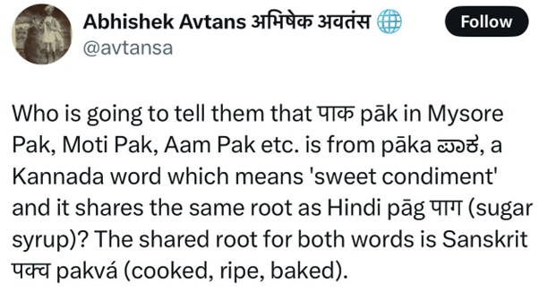 Linguist Abhishek Avtans spelled it out on X: “Who’s going to tell them that Pak in Mysore Pak, Moti Pak etc. is from the Kannada pāka, meaning sweet condiment?”