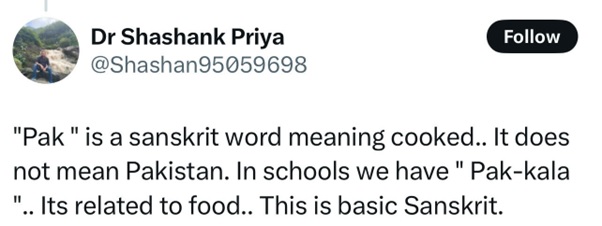 Another user pointed out, “Pak is a Sanskrit word meaning cooked. It does not mean Pakistan. In schools we have Pak-kala… It’s related to food. This is basic Sanskrit.”