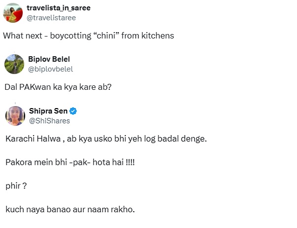 “What’s next — boycotting ‘chini’ from kitchens?” a user quipped. “What do we do about daal PAKwan now?” another asked. “Will these people change Karachi Halwa too? Even pakora has ‘Pak’. Now what?” a netizen wrote.