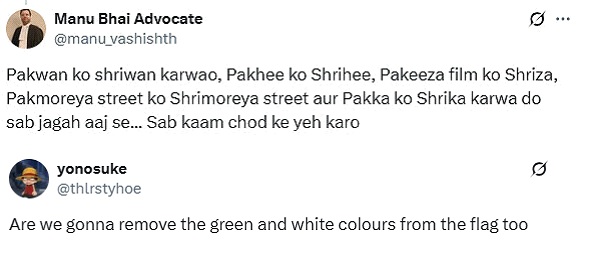 “Let’s change Pakwan to Shriwan, Pakhee to Shrihee, Pakeeza film to Shriza, Pakmoreya Street to Shrimoreya Street and Pakka ko Shrika. Let’s quit work and do this,” another remarked. A user asked if Indians should now consider removing green and white from their flag too.