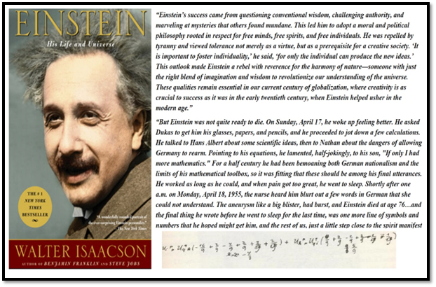 In the last paragraph of the book, the author offers a poignant and deeply human portrayal of Einstein’s final moments. Isaacson writes with reverence and insight, capturing the essence of Einstein’s lifelong dedication to science and his philosophical reflections on life: “But Einstein was not quite ready to die. On Sunday, April 17, he woke up feeling better. He asked Dukas to get him his glasses, papers, and pencils, and he proceeded to jot down a few calculations. He talked to Hans Albert about some scientific ideas, then to Nathan about the dangers of allowing Germany to rearm. Pointing to his equations, he lamented, half-jokingly, to his son, "If only I had more mathematics." For a half century he had been bemoaning both German nationalism and the limits of his mathematical toolbox, so it was fitting that these should be among his final utterances. He worked as long as he could, and when pain got too great, he went to sleep. Shortly after one a.m. on Monday, April 18, 1955, the nurse heard him blurt out a few words in German that she could not understand. The aneurysm like a big blister, had burst, and Einstein died at age 76…and the final thing he wrote before he went to sleep for the last time, was one more line of symbols and numbers that he hoped might get him, and the rest of us, just a little step close to the spirit manifest in the laws of the universe.”