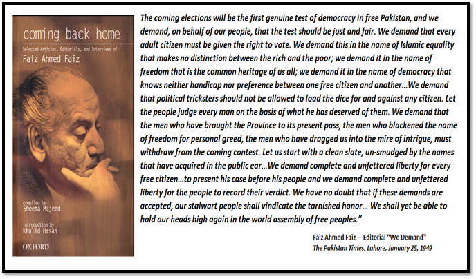Faiz in his editorial “We Demand” (The Pakistan Times, Lahore, January 25, 1949) presents the sentiments of the people about free elections: “The West Punjab Assembly has been dissolved. The selfish pack of men who have, for the last 18 months, reveled in the people's misery and mocked at the nobility of the freedom have been asked to quit. The people of West Punjab have been invited once again to exercise their sovereign right of choosing their own Government. We congratulate the Governor General of Pakistan on this bold and wise decision…The coming elections will be the first genuine test of democracy in free Pakistan, and we demand, on behalf of our people, that the test should be just and fair. We demand that every adult citizen must be given the right to vote. We demand this in the name of Islamic equality that makes no distinction between the rich and the poor; we demand it in the name of freedom that is the common heritage of us all; we demand it in the name of democracy that knows neither handicap nor preference between one free citizen and another. We demand that no one should be given the privilege to arrogate exclusively to himself the past prestige of the Muslim League, a prestige that belongs to the Muslim Nation as a whole. We demand that there should be no party tickets. We demand that political tricksters should not be allowed to load the dice for and against any citizen. Let the people judge every man on the basis of what he has deserved of them.”