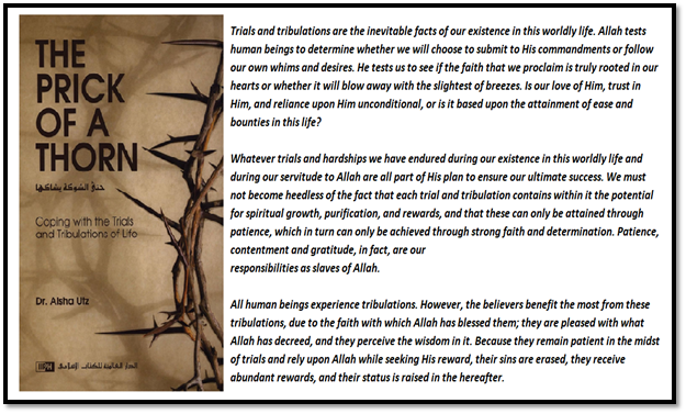 The title is drawn from a well‑known Prophetic tradition in Islam, which teaches that even the smallest harm — “the prick of a thorn”— can serve as expiation for sin. This idea establishes the book’s central thesis: suffering, when properly understood, is not meaningless but can be spiritually transformative. In this regard, the author states: “ The Messenger of Allah (SAW) said: Every fatigue, illness, distress, worry, grief, or harm that befalls the Muslim, including the prick of a thorn, will be accepted by Allah as expiation for some of his or her sins (Bukhari). If only this were restricted to suffering as inconsequential as the prick of a thorn… but Allah informs us that our existence on this earth is destined to be a constant series of trials and tribulations, hardships and challenges…We have certainly created man into hardship (Qur’an 90: 4).”