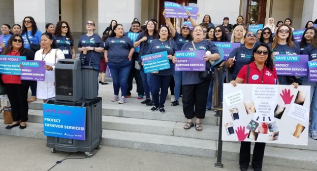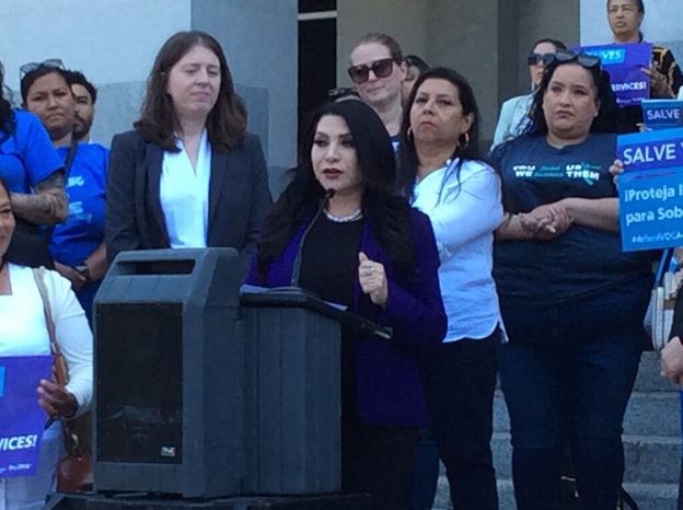 “These programs are so essential,” said Krista Colon, public policy director at the California Partnership to End Domestic Violence, one of the organizers of the rally held to voice concern for the budget cuts.
