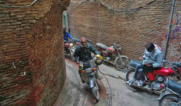Motorcyclists drive through an alley in an old neighborhood in Lahore - AP