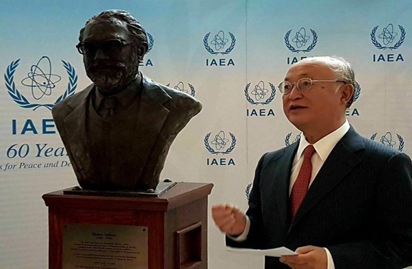 The statue of physicist Dr Abdus Salam – Pakistan’s first Nobel Prize winner – is unveiled at the International Atomic Energy Agency (IAEA) Headquarters in Vienna by IAEA Director General Yukiya Amano