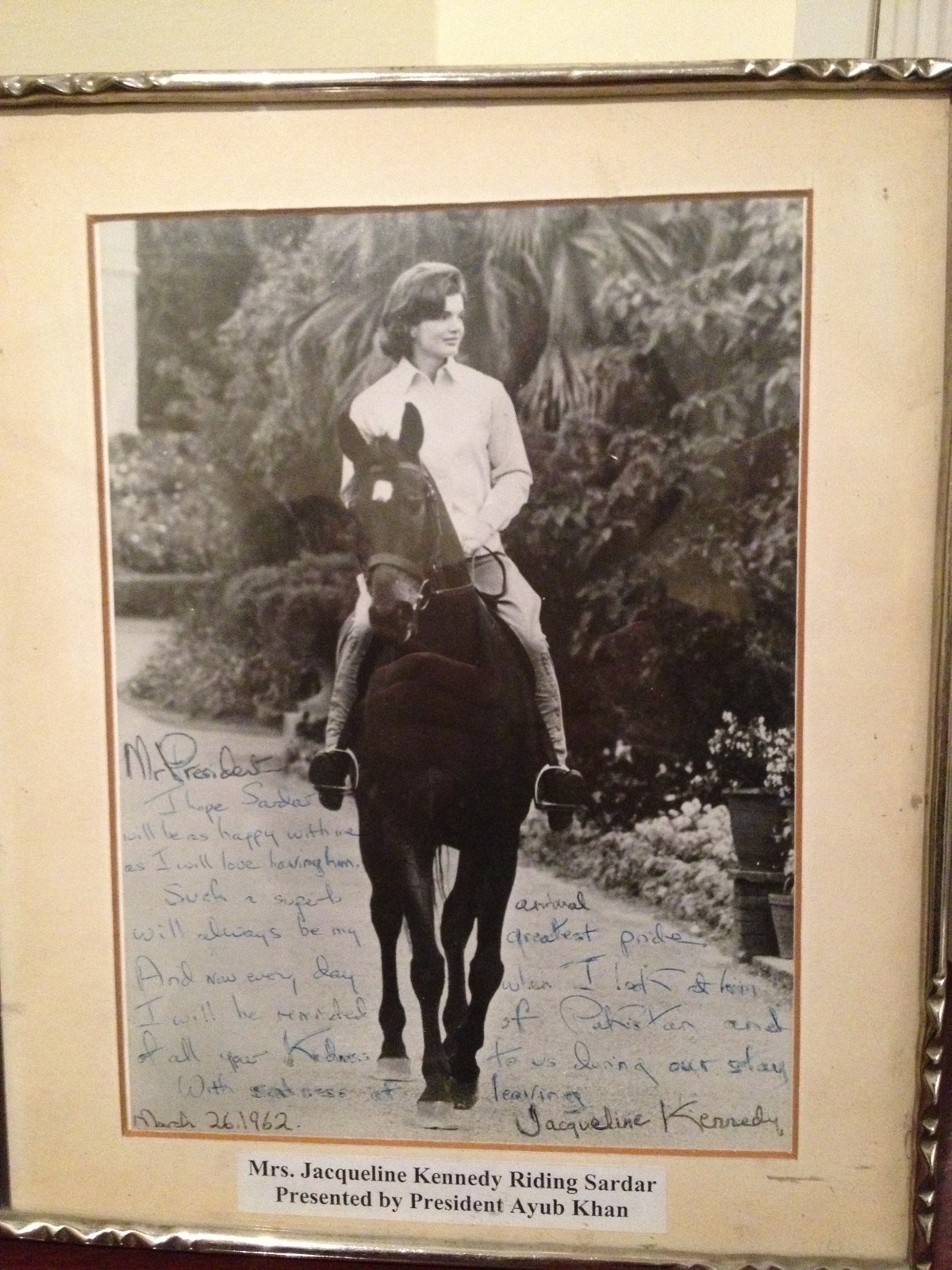 handwritten letter with the warmly signed photograph of her mounted-on Sardar the magnificent horse he had presented to her in the home of Ayub Khan’s eldest son, Gohar Ayub Khan. Sardar would tragically be part of President Kennedy’s cortege. Here is Jackie’s letter: “Mr. President I hope Sardar will be as happy with me as I will love having him. Such a superb animal will always be my greatest pride. And now every day when I look at him I will be reminded of Pakistan and of all your kindness to us during our stay. With sadness at leaving —Jacqueline Kennedy March 26, 1962.”