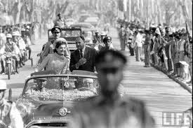 Jackie and Ayub Khan in an open car being warmly welcomed by Pakistanis