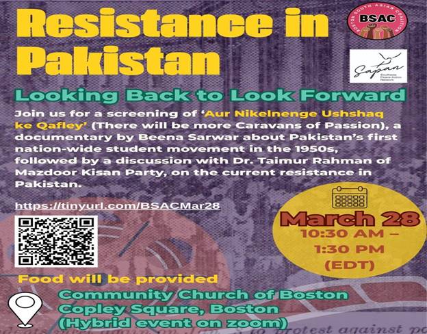 The event, titled “Resistance in Pakistan: Looking Back to Look Forward,” organised by the activist group Boston South Asian Coalition in collaboration with the Southasia Peace Action Network (Sapan) on 28 March, wasn’t just a documentary screening but a mini history lesson.