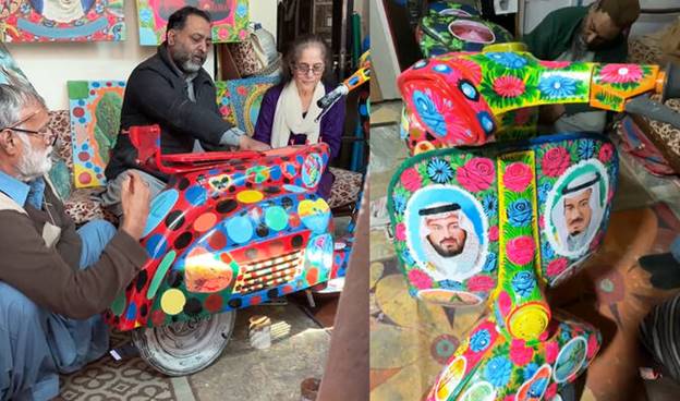 In a modest Islamabad workshop thick with the scent of enamel paint, artist Muhammad Ejaz Ullah Mughal carefully guided his brush across the curved body of a vintage Vespa scooter, covering the metal in blooming florals, intricate foliage and portraits of Saudi Arabia’s King Salman and Crown Prince Mohammed bin Salman as well as landmarks from the Kingdom.