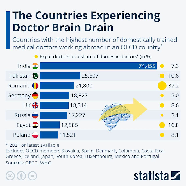 There are 25,607 Pakistani medical school graduates currently working in all of the OECD member countries considered the rich industrialized nations. They account for 10.6% of 242,000 Pakistan-trained doctors practicing now. 74,455 Indian doctors working in OECD nations make up 7.3% of about 1,020,000 of all India-trained doctors in practice.