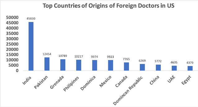 In percentage terms, 21% of foreign doctors come from India, 6% from Pakistan, 5% each from Grenada, Philippines and Dominica and 4% from Mexico.